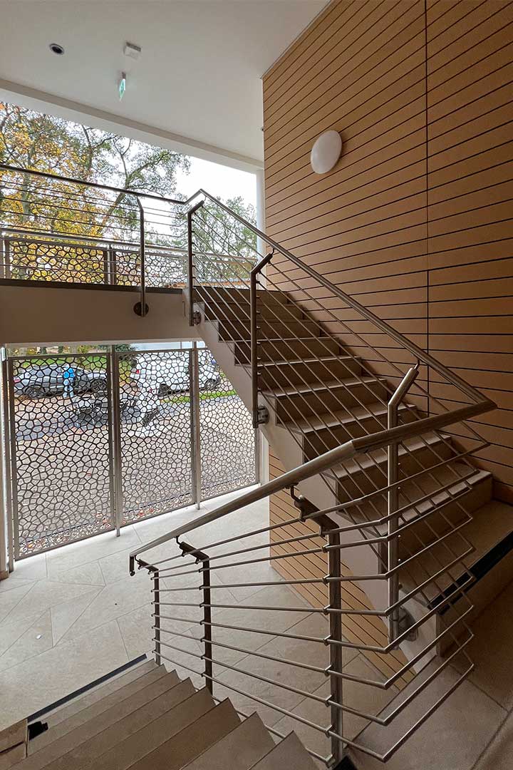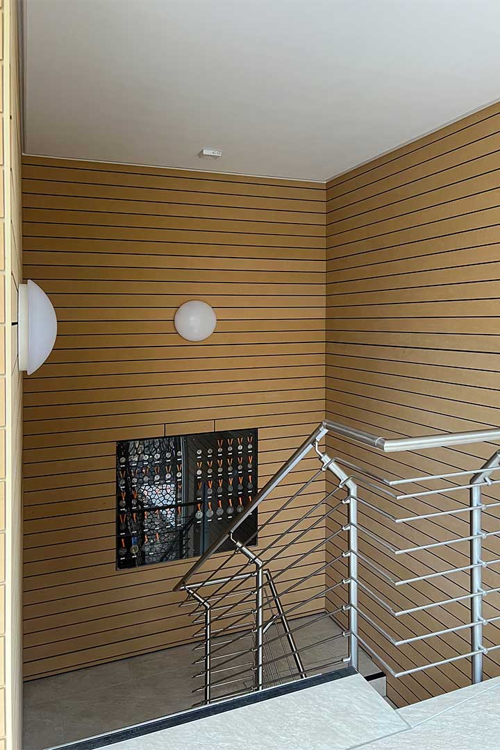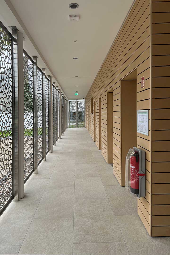 Das strenge Raster der Stahlbetonaußenwände, steht für dtrenge Ordnung, Struktur und Disziplin. Als zweite Ebene der Fassadengestaltung stehen in diesem Zusammenhang die changierenden senkrechten Farbflächen in hellen Blau-Grau-Grüntnen. Diese treten in regelmäßigen Sequenzen auf und sind in den drei horizontalen Ebenen gegeneinander versetzt. Dies vermittelt neben der Klarheit und Strenge auch das Element der Wiederholung.