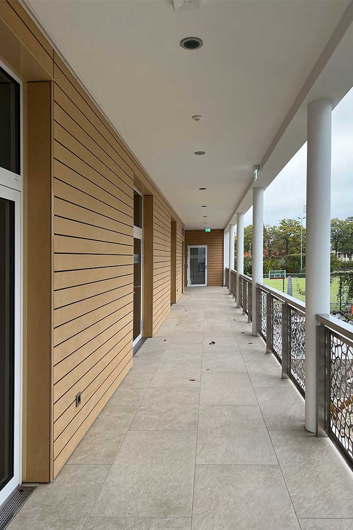 Über einen gläsernen Zwischenbau ist die Sporthalle mit dem Sport- und Kurshaus verbunden. An die Sporthalle schließt direkt der Schulhof des Gymnasiums an, dessen Gestaltungslinien in der „Bühne“ vor der Halle aufgenommen wurden.